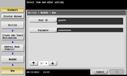 1. Tap [Utility] - [One-Touch/User Box Registration] - [Create One-Touch Destination] - [Address Book (Public)] - [WebDAV] - [New].