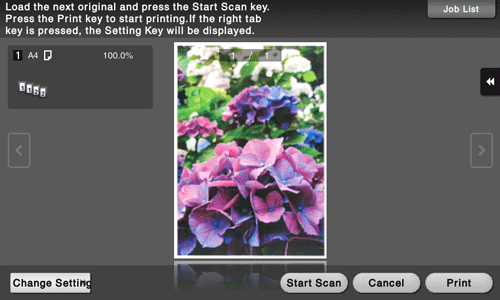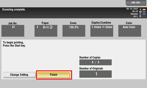 After all originals are scanned, tap [Print] or press the Start key.