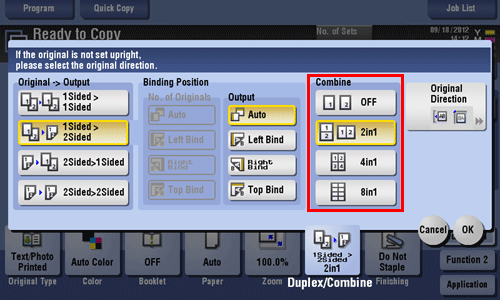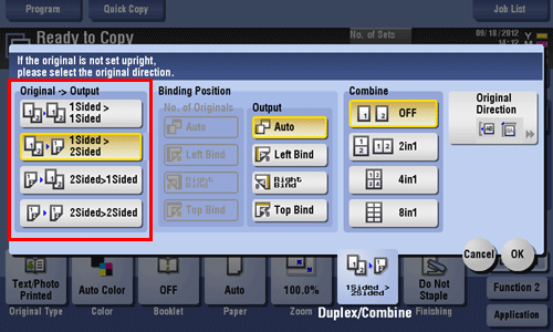 • For 2-sided originals, select the binding positions of [No. of Originals] and [Output].