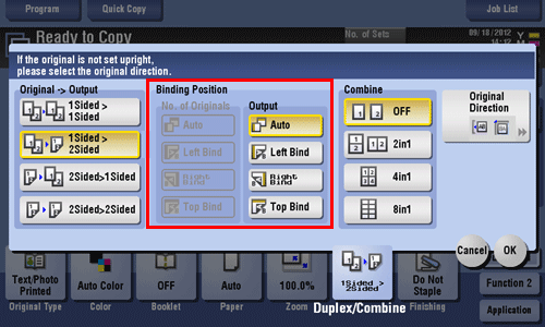 • For 1-sided originals, select the binding position of [Output].