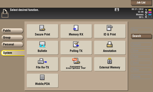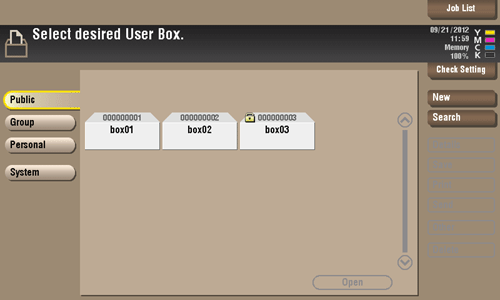 The System Box is used by the system to temporarily store files when the user uses the facsimile or print function together with the file storage function of the box.
