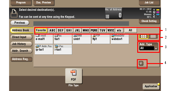 2 | Displays the registered destinations either as buttons or in a list. If switched to the list display, you can sort the destinations by registration numbers, destination types, or in alphabetical order of destination names. |