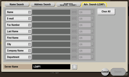 Tap [Addr. Search] - [Search] - [Address Search (LDAP)] or [Adv. Search (LDAP)].