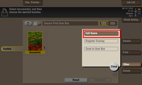 Select a file, then tap [Other] - [Edit Name]. Now you can rename the file. Enter a new name from the Touch Panel.