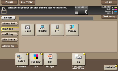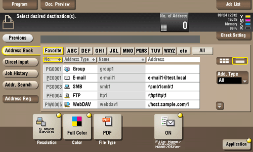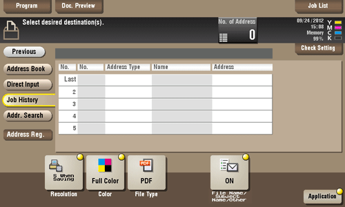 Tap [Job History], and you can select a destination from the scan or saved job history.