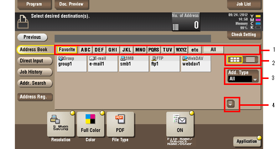 2 | Displays the registered destinations either as buttons or in a list. If switched to the list display, you can sort the destinations by registration numbers, destination types, or in alphabetical order of destination names. |