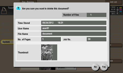 Select a file, then tap [Delete]. The file is deleted. You can select multiple files and delete them simultaneously. Check the file details, then tap [Yes].
