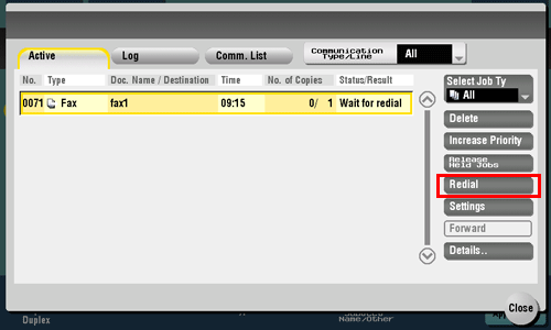 Pending jobs for resending are resent automatically after a certain period of time has elapsed using the auto redial function. However, you can manually resend the fax.