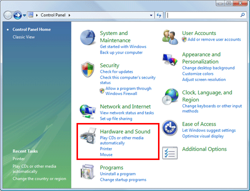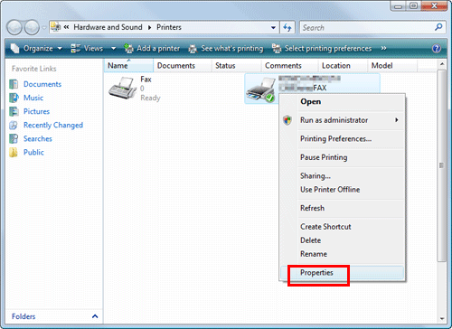 • In Windows Vista/Server 2008, click the Start menu, and select [Control Panel] - [Hardware and Sound] - [Printer].