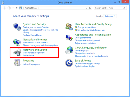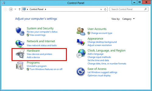 • In Windows Server 2012/Server 2012 R2, open the Start window, then click [Control Panel] - [Hardware] - [View devices and printers].