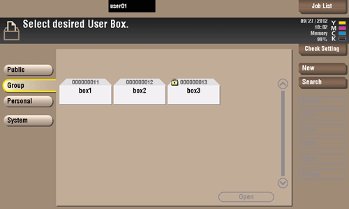 To access a file in this User Box, select the desired User Box, then tap [Open].