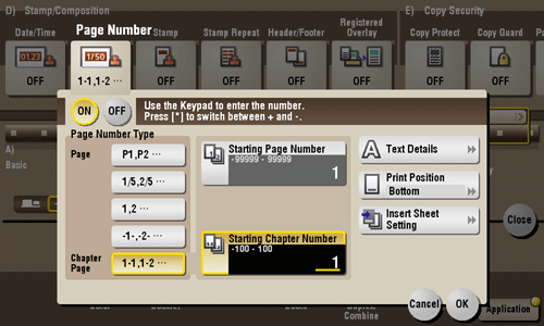 Enter the starting chapter number if an original is divided into chapters, and you want to print chapter numbers from the second chapter using Keypad. To display the Keypad, tap the input area for the numeral. You can specify chapter numbers only when you have selected [Chapter Page] in [Page Number Type]. For example, to print chapter numbers from the third chapter, enter "-1". The first chapter of the file is counted as "-1", and the second chapter as "0", and the third chapter is counted as "1". In [Starting Chapter Number], chapter number is printed on the chapters that are count as 1 and later. If "2" is entered, number is printed from the first page of the first chapter of the file as "2-1, 2-2". "-" (minus sign) changes to + each time you tap [*].