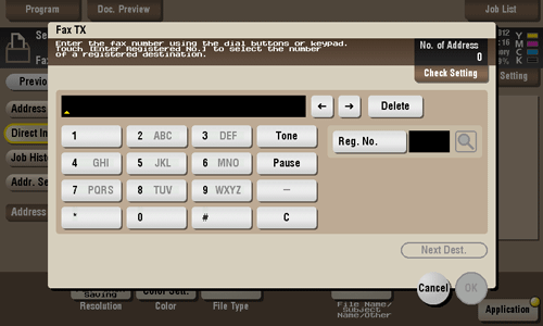 Tapping [Reg. No.] allows you to specify a fax destination by a registered number.