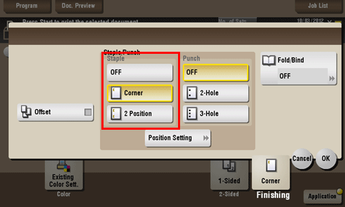 [2 Position] | Each set of printed sheets is stapled at two positions (in the top, left, or right) before it is output. |