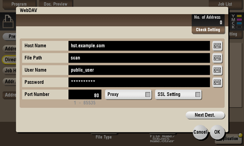 [File Path] | Enter the name of a destination folder in the WebDAV server specified in [Host Name] with up to 142 bytes.