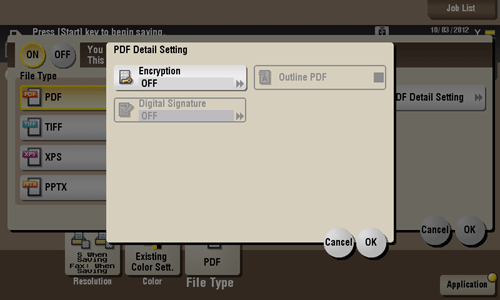 [Encryption] | Select [ON] to encrypt a file. Enter the password to restrict access to the file. To specify permissions for printing and editing PDFs more in detail, enter an authorization password, then specify [Encryption Level], [Printing Allowed], [Copy Contents], and [Changes Allowed]. For details, refer to Here. |