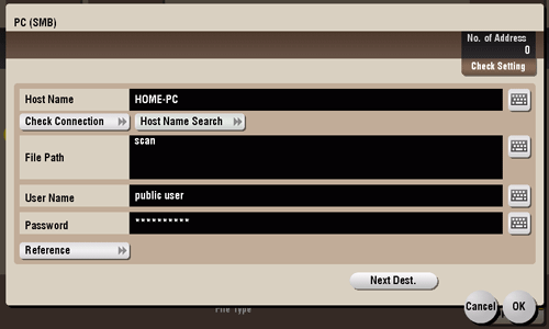 [Reference] | On the Touch Panel, search for a computer to send a file to, and select a target shared folder. When the authentication screen appears, enter the name and password of a user who has privileges to access the selected folder. After authentication, [Host Name] or [File Path] is entered automatically. The Reference function may fail under the following conditions.