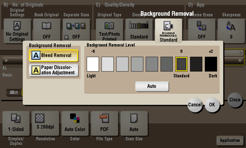 Tap this button to adjust the density of the background color for an original with the colored background. Selecting [Auto] automatically determines the density of the background color, and scans an original at the optimum background density level.