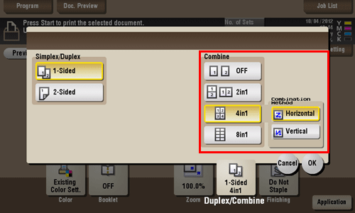 If [4in1] or [8in1] is selected, you can set the combined page layout to [Horizontal] or [Vertical].