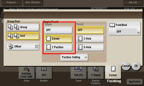 Each set of printed sheets is stapled in a corner (top left or top right) before it is output.