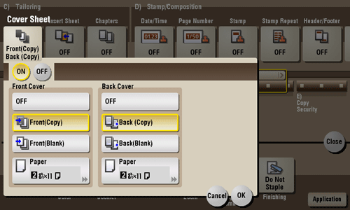 • [Paper]: Select the paper used for cover sheet. Use the same size cover and body sheets, and stack them in the same orientation. In bizhub C554e: You can select the paper tray of the Post Inserter when [Front (Blank)] is selected while the Post Inserter is installed.