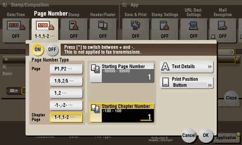 [Starting Chapter Number] | Enter the starting chapter number if an original is divided into chapters, and you want to print chapter numbers from the second chapter using Keypad. To display the Keypad, tap the input area for the numeral. You can specify chapter numbers only when you have selected [Chapter Page] in [Page Number Type]. For example, to print chapter numbers from the third chapter, enter "-1". The first chapter of the file is counted as "-1", and the second chapter as "0", and the third chapter is counted as "1". In [Starting Chapter Number], chapter number is printed on the chapters that are count as 1 and later. If "2" is entered, number is printed from the first page of the first chapter of the file as "2-1, 2-2". "-" (minus sign) changes to + each time you tap [*]. |
