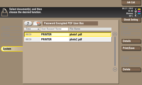 When a password protected PDF file is printed out or stored in the User Box by using the Direct Print function or from a USB memory or a Bluetooth device, the file is stored in the Password Encrypted PDF User Box. Once you have opened the User Box, you can select a PDF file stored in the User Box to preview and print it out. Also, you can store the file in or delete it from the User Box.