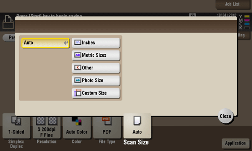 [Metric Sizes] | Select this option to scan a metric-size file. Tap [Metric Sizes], and select the standard metric size respectively. |