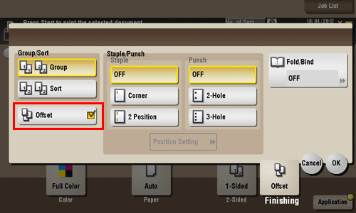 If the Finisher or Job Separator JS-506 is installed, the printed sheets are fed out and stacked on top of each other with each copy or page set staggered to separate them.