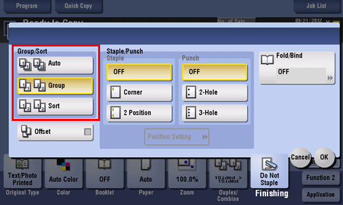 [Auto] | Automatically switches between Sort and Group according to the number of printed sheets for each set, and feeds out. If the number of printed sheets for each set is 1, the Group function is applied. If the number is 2 or larger, the Sort function is applied. |