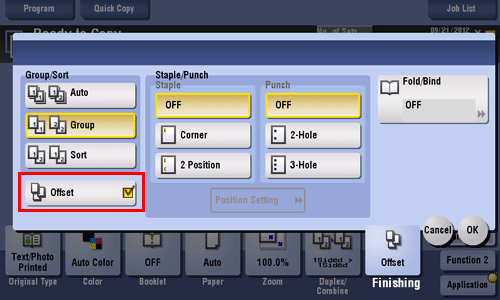If the Finisher or Job Separator JS-506 is installed, the copies are fed out and stacked on top of each other with each copy or page set staggered to separate them.