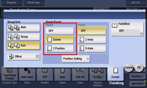 [Position Setting] | Select the punch position and original loading direction. If [Auto] is specified for the punch position, the punch position is determined automatically based on the direction of the loaded original. |