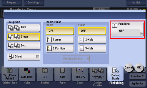 [Fold/Bind] | Staples copy outputs in the center the paper or fold them in the center before discharging.