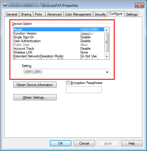 If the [Auto] of [Obtain Settings...] is disabled and if you click [Obtain Device Information], the current information of this machine is obtained and reflected on the [Device Option].