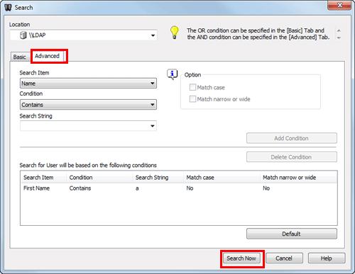 The [Advanced] search displays the recipient which matches all of search conditions. Select the [Search Item] and [Condition]. Then, enter characters to search, then click [Add Condition]. Specify multiple search conditions if necessary, then click [Search Now].