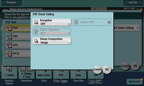 [Digital Signature] | Select [ON] to add a digital signature (certificate) of this machine to a PDF file, and select [SHA1] or [SHA256] as the encryption level of the signature. You can certify the author of a PDF, and prevent forgery or unauthorized modification. This function is enabled when a certification is registered on this machine. |