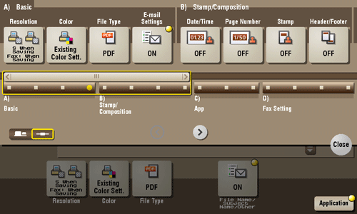 Sets application options to notify the storage of file data by E-mail, to change the FAX sender information and others.