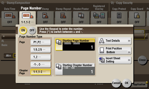 Enter the starting chapter number if an original is divided into chapters, and you want to print chapter numbers from the second chapter using Keypad. To display the Keypad, tap the input area for the numeral. You can specify chapter numbers only when you have selected [Chapter Page] in [Page Number Type]. For example, to print chapter numbers from the third chapter, enter "-1". The first chapter of the file is counted as "-1", and the second chapter as "0", and the third chapter is counted as "1". In [Starting Chapter Number], chapter number is printed on the chapters that are count as 1 and later. If "2" is entered, number is printed from the first page of the first chapter of the file as "2-1, 2-2". "-" (minus sign) changes to + each time you tap [*].