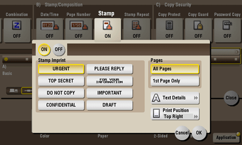 Text such as "PLEASE REPLY" and "DO NOT COPY" are printed on the first page or all pages. You can select the text to be printed from the registered fix stamps and arbitrary registered stamps.
