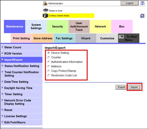 1. In the administrator mode, select [Maintenance] - [Import/Export] to select the information to be imported, then click [Import].