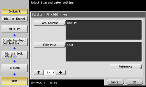 Tap [Utility] - [One-Touch/User Box Registration] - [Create One-Touch Destination] - [Address Book (Public)] - [PC (SMB)] - [New].
