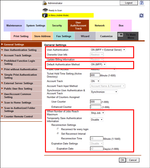 In the administrator mode, select [User Auth/Account Track] - [General Settings], then configure the following settings.