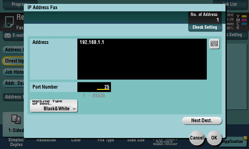 Enter a destination IP address or E-mail address when scanned original data is sent by IP address fax. Also, select whether the recipient machine supports color printing.