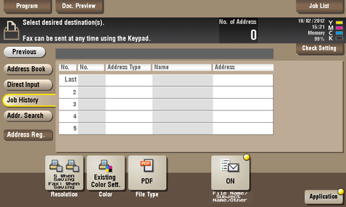 Tap [Job History], and you can select a destination from the scan or fax history. The latest jobs (up to five) are displayed for history purposes. When necessary, multiple destinations can be selected from the history.