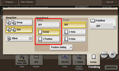 [2 Position] | Each set of printed sheets is stapled at two positions (in the top, left, or right) before it is output. |