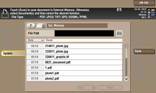 Once you have opened the User Box, you can print out a file stored on a USB memory. Also, you can read the original data and directly save it as a file in the USB memory. You can also move a file from the USB memory to the External Memory User Box.