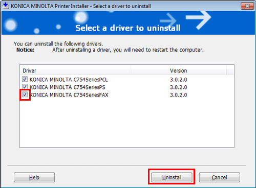 From the Start menu, click [All Programs] (or [Programs]) - [KONICA MINOLTA] - [C754Series (PS_PCL_FAX)] - [Uninstall Printer Driver].
