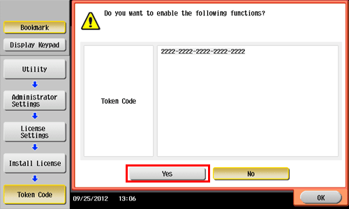 Select [Utility] - [Administrator Settings] - [License Settings] - [Install License] - [Token Code], and enter a token number.