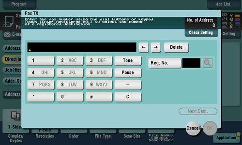 Tapping [Reg. No.] allows you to specify a fax destination by a registered number.