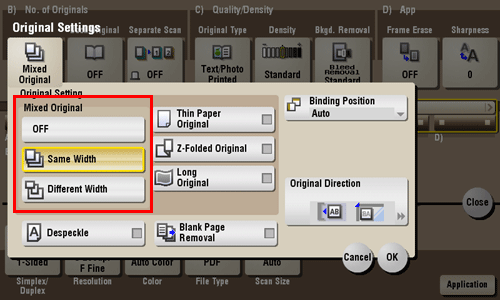 Even for an original with pages of different sizes, by using the ADF, you can scan data while detecting the size of each page. If the widths of the originals are the same, select [Same Width]. If the widths of the originals are different, select [Different Width].